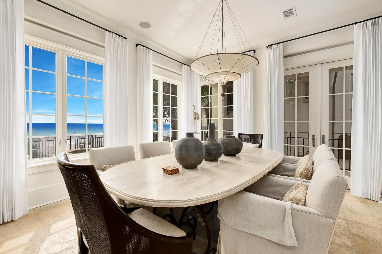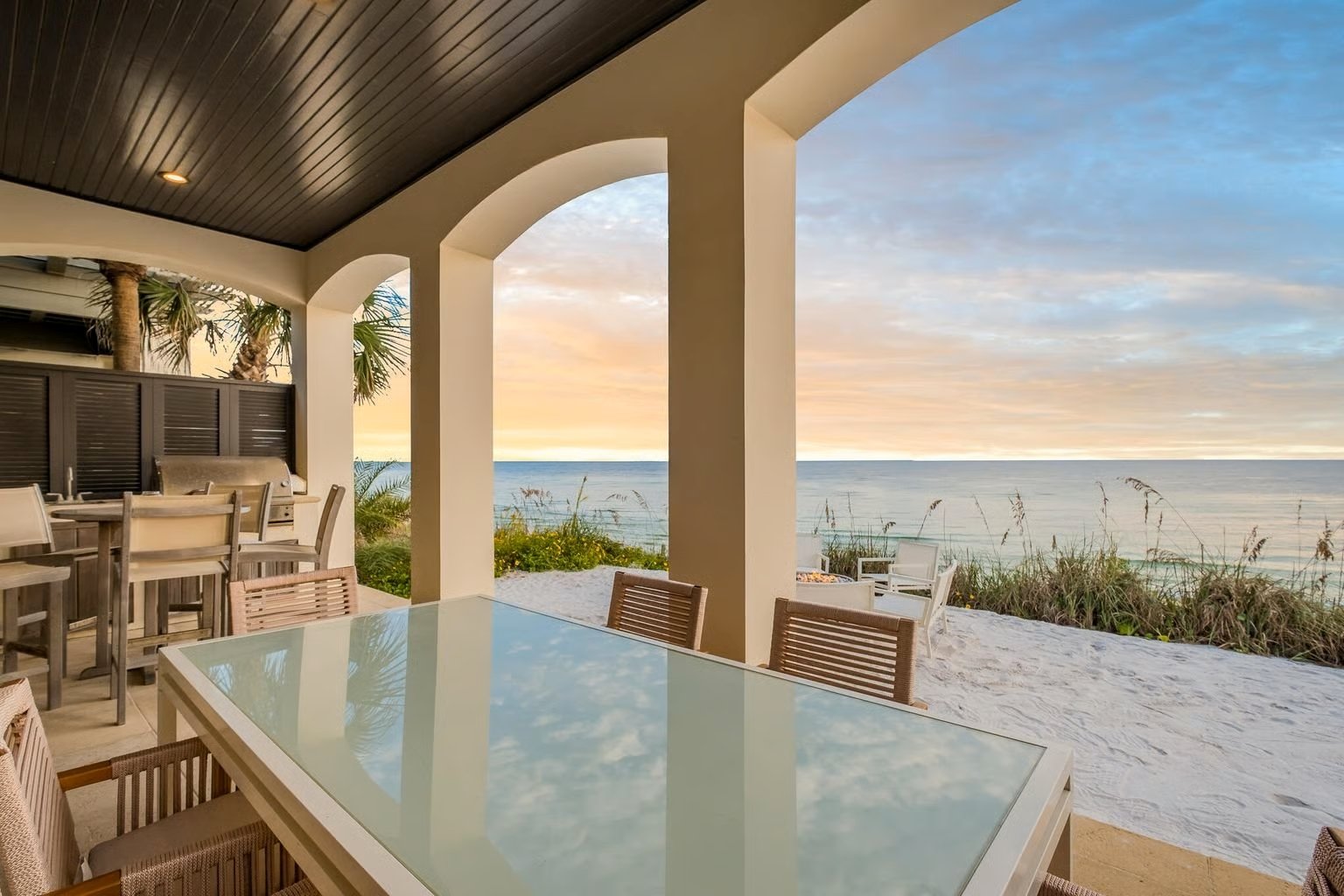 This incredible Gulf-front residence designed by architect Dawn Thurber and built by John Willis Homes has just been updated with new interior and exterior furniture curated by Harrison Design Atlanta – Karen Ferguson, ''Southeast residential Designer of the Year.'' Located front and center within The Retreat, it is only two lots to the east of the redesigned Gulf-front Beach Club, which features an infinity edge pool and private beach access and will open Memorial Weekend 2022. Very few homes have four complete levels of living space and even fewer have a Gulf Front outdoor entertaining area with unobstructed views of the beach...this home has it all! Entering the home through the second-floor main entrance, your attention is immediately drawn to the rear of the home where the private sugar white sand beach and emerald green waters contrast. This second level has beautiful travertine flooring throughout the formal dining room, breakfast room and adjoining gourmet kitchen creating a light atmosphere that is as chic as it is comfortable. The galley kitchen is designed to accommodate multiple chefs with two sinks, two distinct prep areas and professional grade appliances. A cavernous pantry lends increased capacity to the already ample cabinet storage. The kitchen overlooks a sunken living room and is connected by an elevated bar top. Wood ceiling beams nod to the antique hardwood floors while a limestone fireplace surrounded by built-in cabinetry enhances the sense of permanence. Tall windows and French doors expose a generous outdoor entertaining space with covered porch, built-in grill, outdoor fire pit and four custom lounge chairs each with their own privacy shade. The swimming pool and hot tub are embedded as one with the hot tub acting as the waterfall into the pool.