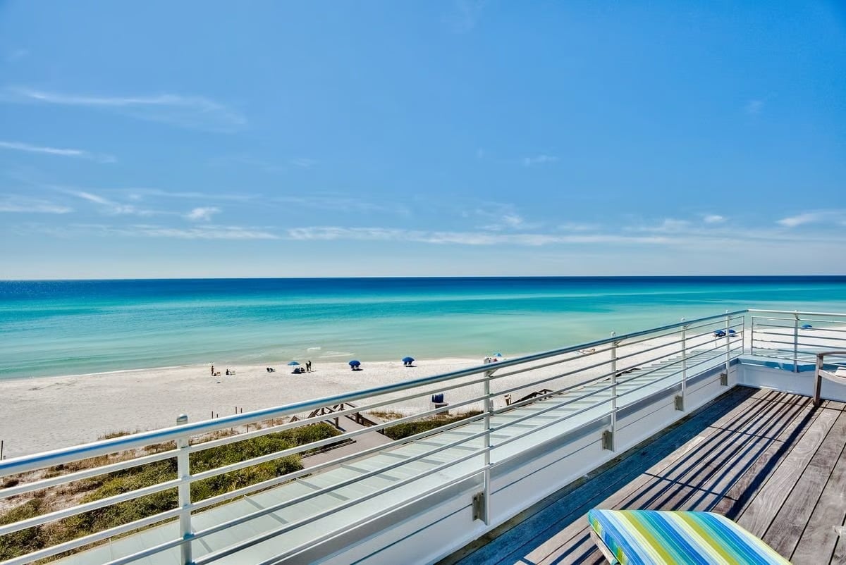 Offering an ideal location in Seagrove Beach, this gulf-front home features an expansive floor plan and panoramic water views. A true coastal retreat, this home has been well maintained and has been refreshed with white paint both inside and out. A private courtyard leads to the entrance, which then opens to reveal light, bright, and open main living areas that boast incredible views of the Gulf of Mexico. Prepare meals in a chef’s kitchen with a beautiful coffered ceiling, two pantries, high-end appliances, double ovens, and a large island with room to seat eight. Perfect for entertaining, the home features a fully-equipped wet bar and large area for formal dining while French doors lead out to a spacious deck that overlooks emerald green waters.