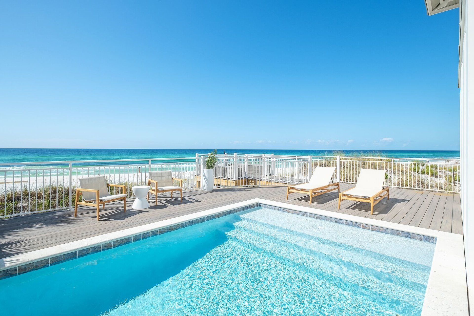 This beautiful gulf-front beach house is an outstanding bespoke property enjoying an incredible position on 0.69 acres. With 61 feet of coveted beach frontage and a depth of 467 feet, this one-of-a-kind property extends to the high water mark with a private gated walkway providing easy access to the white sandy beach. The peaceful location, on a road with no through traffic, can be enjoyed from porches on all three levels. A wrap-around balcony provides boundless views of the sparkling emerald Gulf and Eastern Lake, just behind the property. There's ample space for dining, relaxing and outdoor entertaining on the spacious deck surrounding the gulf-front heated pool. Steps lead down to the undulating dunes with waving sea grass and the stunning beach beyond.