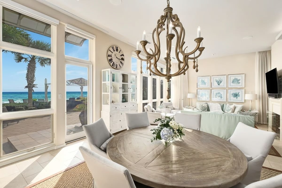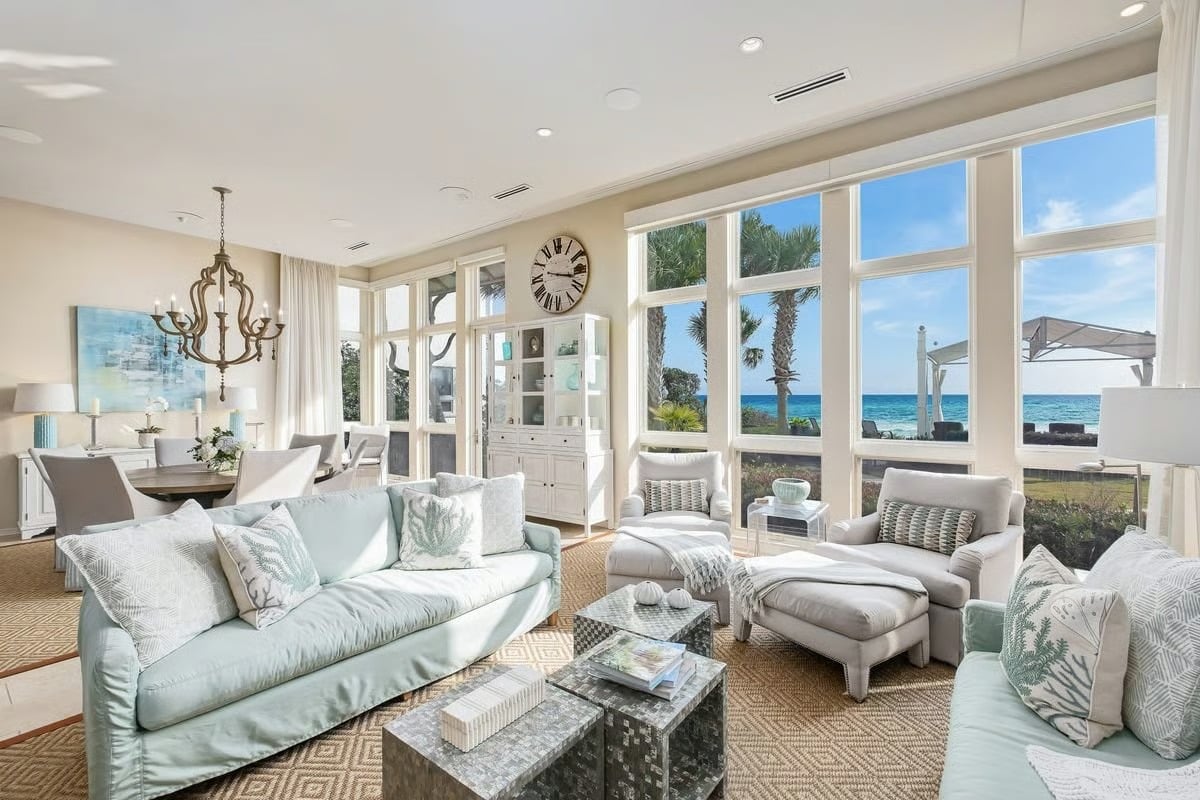 This Seagrove gulf front home, crafted by Thurber Architects, exudes coastal sophistication and elegant charm. Upon entry, the sweeping gulf views from the beach-facing living area, with its floor-to-ceiling windows, will take your breath away. Every detail in this 4,276 square foot home has been thoughtfully considered, from the floating European white oak staircase to the soothing color palette and exquisite finishes. Set atop a high beach dune, this one-of-a-kind residence features 60 feet of private direct beach access and generous gulf-frontage. Spend evenings by the fireplace in the living room or entertain guests in the dining room or under the Sunbrella Arbor on the gulf front pavilion.