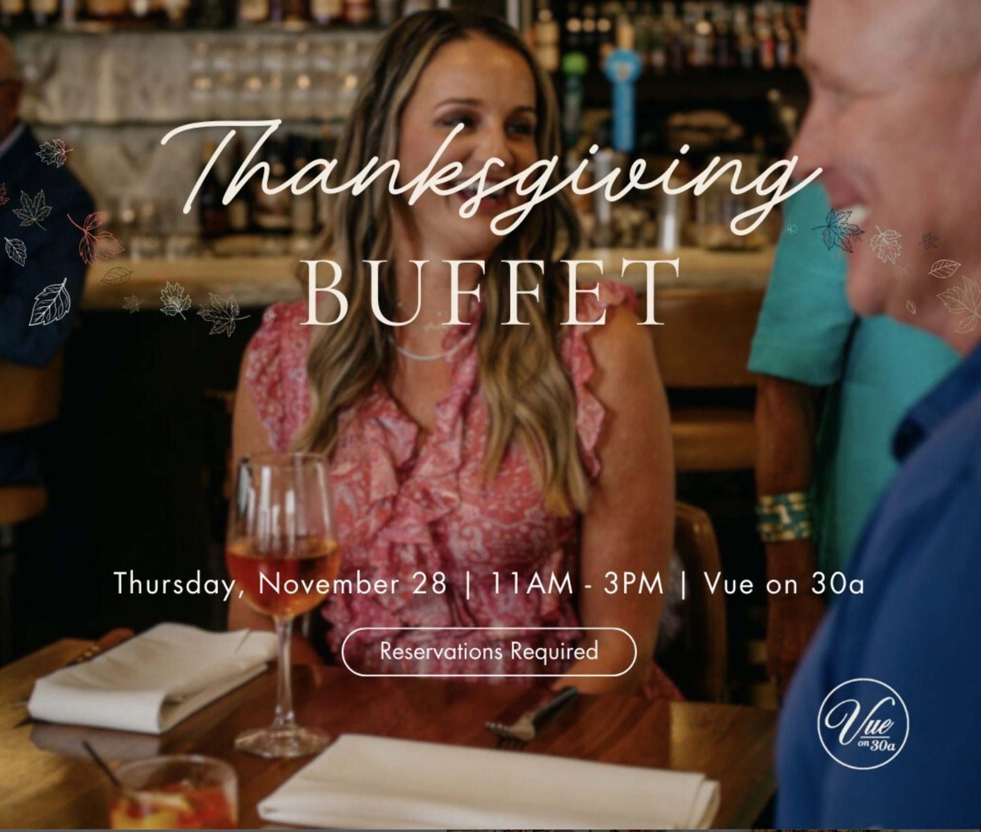 Vue On 30A (Blue Mountain Beach): Take part in a gourmet Thanksgiving feast, featuring traditional dishes with an elegant twist. Cost is $85 for adults and $30 for children older than three. Reservations are required by calling 850.267.2305 or visit their website here.