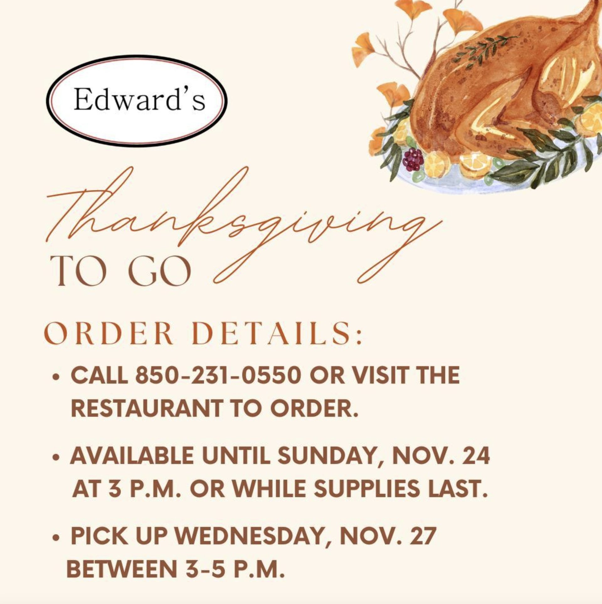 Edward’s (Rosemary Beach): Dine at home with a Thanksgiving feast prepared by Chef Josh and his culinary team. Orders may be placed by calling 850.231.0550 or visiting the restaurant through November 24 at 3 p.m., and should be picked up between 3 and 5 p.m. November 27. Click here for more info.