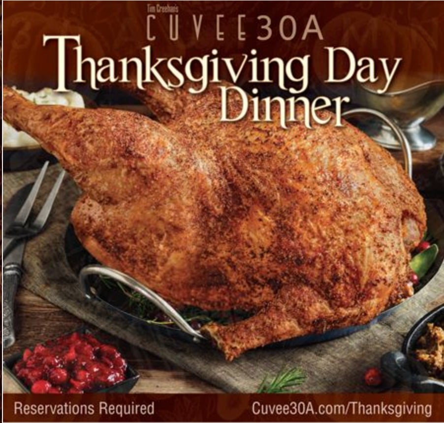Cuvee 30A (30 Avenue): Enjoy Chef Tim Creehan’s scrumptious Louisiana fried turkey and an assortment of traditional trimmings, side dishes and desserts. Visit cuvee30a.com thanksgiving for menu and reservation opportunities, which are required. Cost is $89.99 for adults and $49.99 for children younger than 10.
