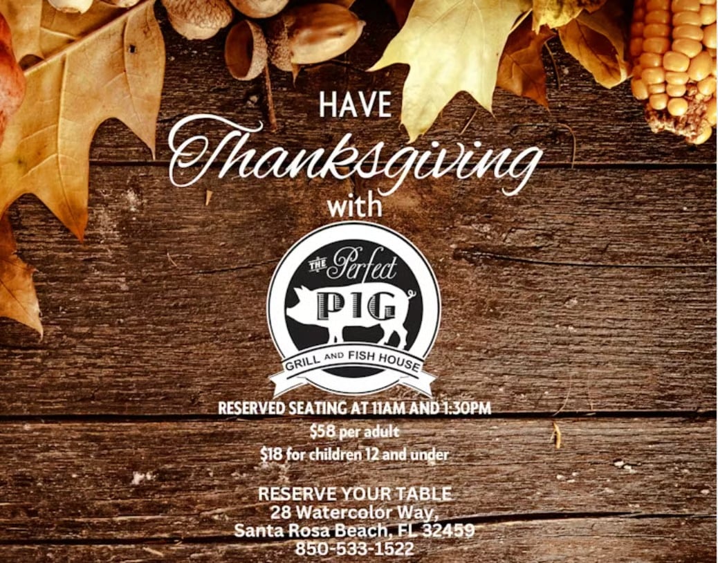 The Perfect Pig (Watercolor): A Thanksgiving buffet will be on the menu with two seatings at 11 a.m. and 1:30 p.m. Additionally, the Seagrove location will be open for breakfast from 8 to 11 a.m. Thanksgiving Day. The Seagrove location also offers “Everything But The Turkey” packages for pick up on Wednesday. View the WaterColor menu.