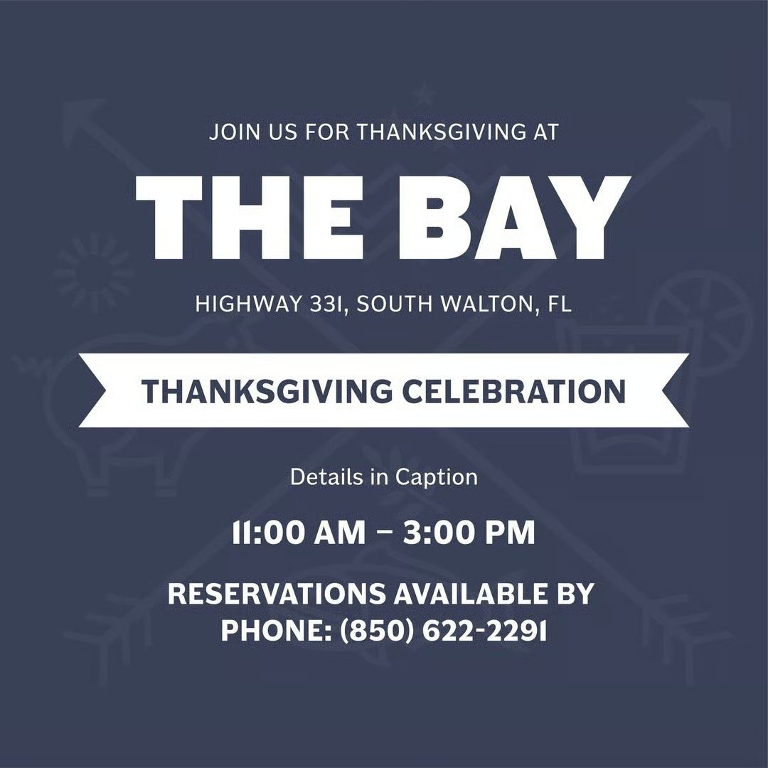 The Bay (Hwy 331 South, at the foot of the bridge): Thanksgiving celebration - Reservations open starting November 1. Call 850.622.2291 to save a seat. Dinner Options include: Turkey Dinner , Filet Oscar, Ribeye, Grill Grouper, Crabmeat Saki Beurre Blanc, Rack of Lamb. Click here for more info.