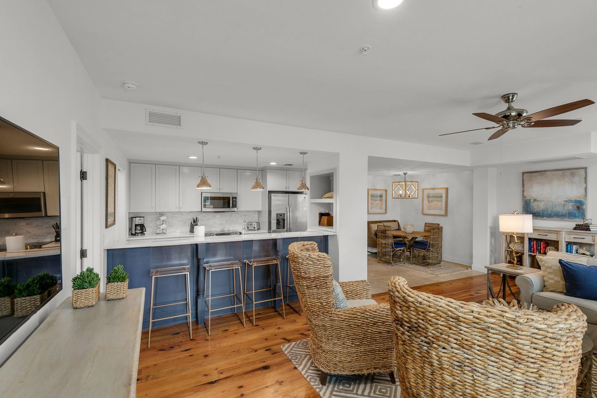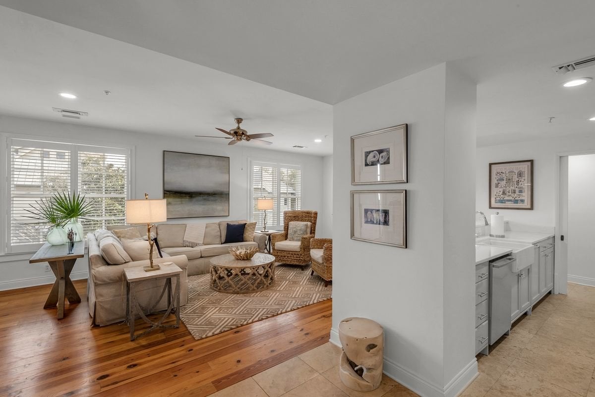 Indulge in the Rosemary Beach way of life by residing in this lavishly furnished condo that overlooks the Town Square. Sunlight floods the well-designed, open-plan living area of this exquisite loft haven. The polished wood flooring lends a lustrous shine to the cozy dining area and sitting room. Unwind and take in the fresh ocean breezes and magnificent rooftop views by opening the doors to the balcony from the living room. The chef's kitchen, which boasts an abundance of storage, a double butler's sink, and stainless steel appliances, is a cook's paradise. The high-top breakfast bar, complete with blue accents and hanging lights, is the perfect spot to start or end the day with a cup of coffee, pancakes, or cocktails. This deluxe condo comes equipped with a laundry closet that houses a stackable washer-dryer, a bunk room, two spacious bedrooms, and two luxurious bathrooms. It includes a designated parking space and a ground-level storage unit for beach gear and water toys. The pearly white beach and emerald Gulf are just a short walk away.