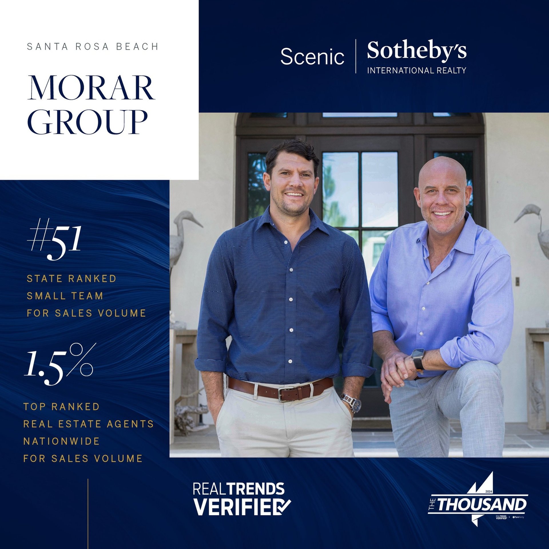 Santa Rosa Beach, Fla. – Scenic Sotheby’s International Realty proudly announces that the Morar Group has been recognized in the 2024 RealTrends Verified + The Thousand rankings. This annual report identifies America's top 1,000 residential real estate agents and teams based on 2023 sales volume and transaction sides. The group, consisting of broker-owner Blake Morar and broker associate Ron Hefner, ranked within the top 1.5% of real estate agents nationwide for sales volume and placed No. 51 among small teams in Florida for sales volume.