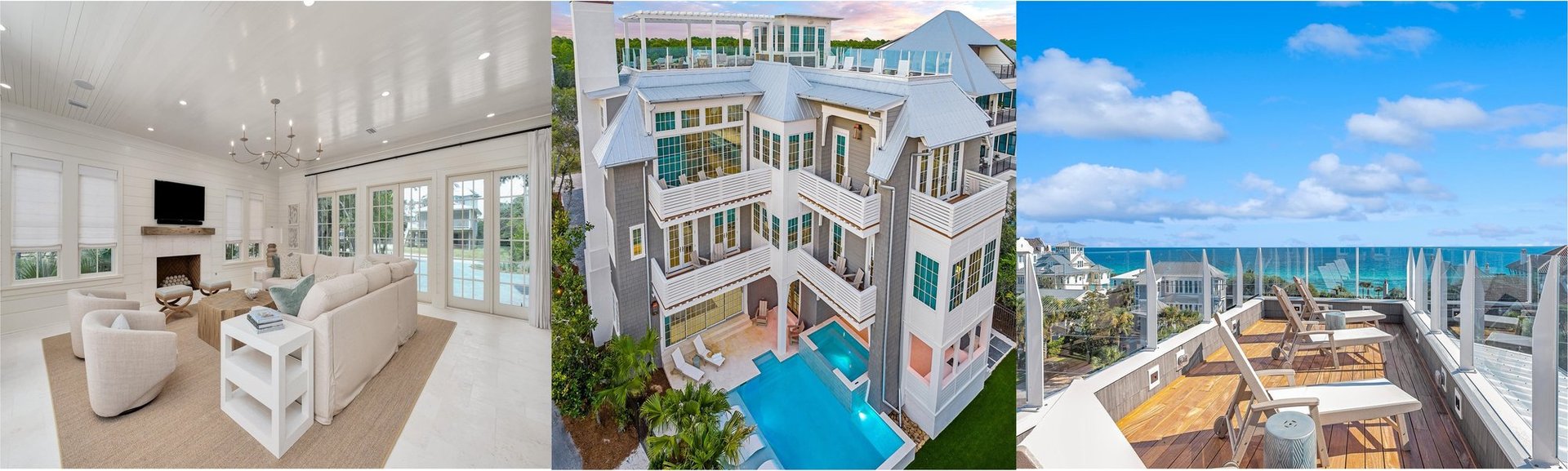 The upper floors are adorned with white oak ceilings, reclaimed beams, and light oak floors. The main level boasts hardwearing shell stone tiles that extend outdoors to the pool area and summer kitchen, providing direct access to Montgomery Street beach. The first floor surprises with a secondary living room, game room, laundry facilities, and a bespoke bunk room. The second floor houses guest suites and six bedrooms, central living space, and an additional laundry. The third floor, the pinnacle of the house, features a chef's kitchen and a living room with panoramic views of the gulf. The dining area is graced with custom features and Taj Mahal countertops, while the master suite on this floor offers private terraces and a spa-like bathroom. The rooftop deck provides expansive views and stunning sunsets. Situated on Scenic Highway 30A, the home is close to the white sand beaches of the gulf and renowned for its shopping, dining, and entertainment options. This home is a luxurious yet welcoming coastal retreat, perfect for those who appreciate a mix of opulence and comfort.
